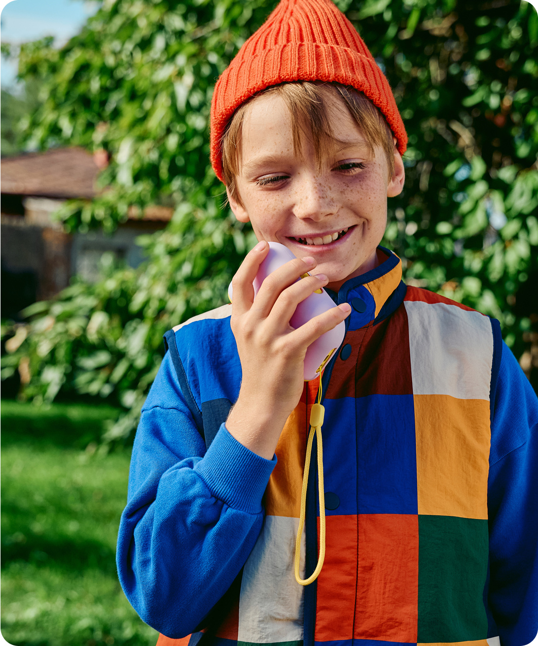 Sprachnachrichten senden & empfangen, entweder an andere Kinder mit einem NODI Flip oder an Erwachsene über die NODI Eltern-App (iOS/Android).