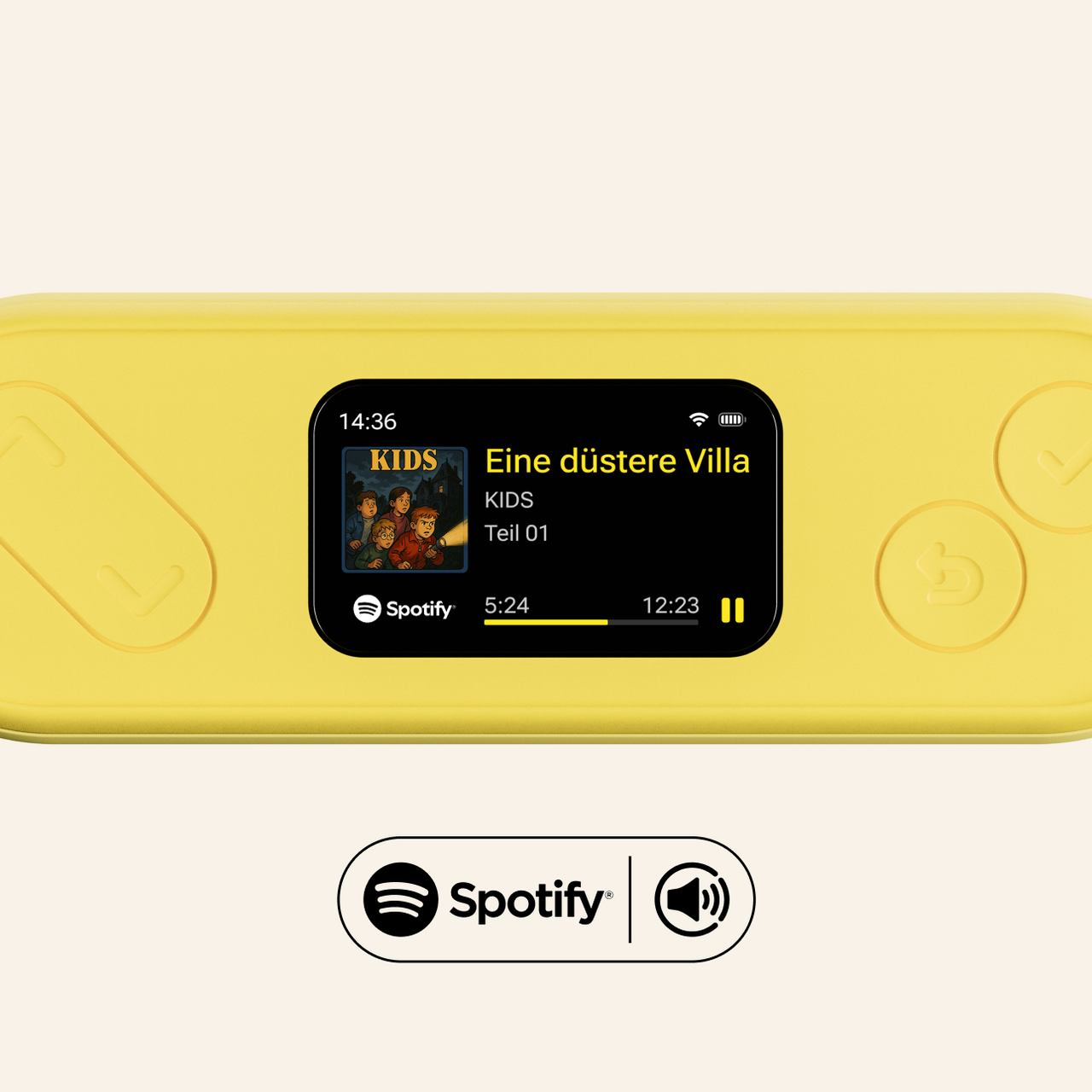 "Walkman für die Streaming-Ära: ein kleines, robustes Gerät, mit runden Ecken und Kanten, ohne Touchscreen. Bedient wird es über große Knöpfe und ein minimales Menü. Multitasking ist ausgeschlossen: Wer eine Nachricht abhört, muss das Hörspiel stoppen."