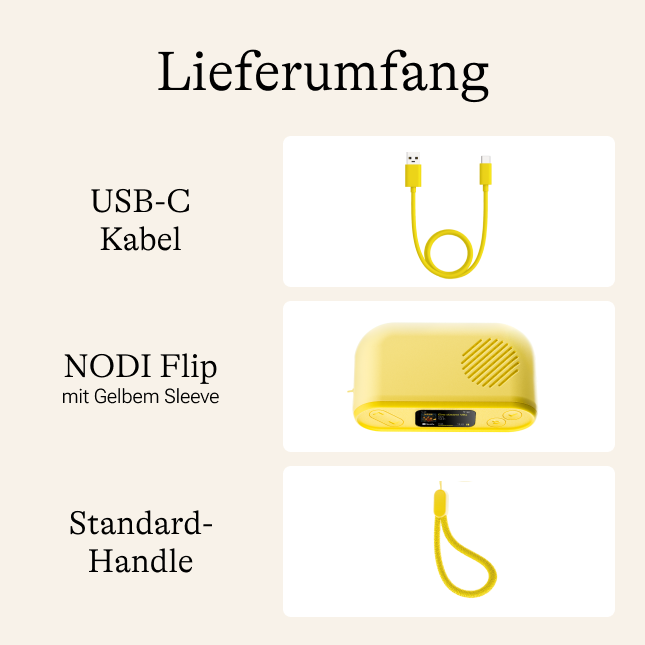 • Inkludiert: NODI Flip, USB-C Ladekabel, Standard Handle, Bedienungsanleitung